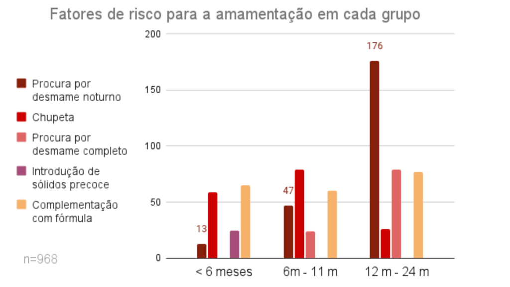 Ao comparar 968 casos casos de bebês amamentados entre 0- 24 meses cujas mães manifestaram insatisfação ou preocupação com o sono do bebê, acompanhados individualmente entre 2018 e 2022 através da consultoria materna, foi identificada a incidência de fatores de risco para a amamentação como introdução precoce de alimentos complementares (abaixo de 6 meses), uso de chupeta, fórmula infantil e desejo de desmame (parcial ou total).