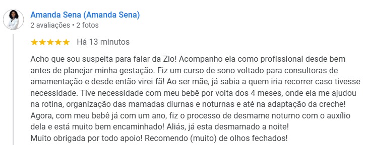 Acho que sou suspeita para falar da Zio! Acompanho ela como profissional desde bem antes de planejar minha gestação. Fiz um curso de sono voltado para consultoras de amamentação e desde então virei fã! Ao ser mãe, já sabia a quem iria recorrer caso tivesse necessidade. Tive necessidade com meu bebê por volta dos 4 meses, onde ela me ajudou na rotina, organização das mamadas diurnas e noturnas e até na adaptação da creche! Agora, com meu bebê já com um ano, fiz o processo de desmame noturno com o auxílio dela e está muito bem encaminhado! Aliás, já esta desmamado a noite!