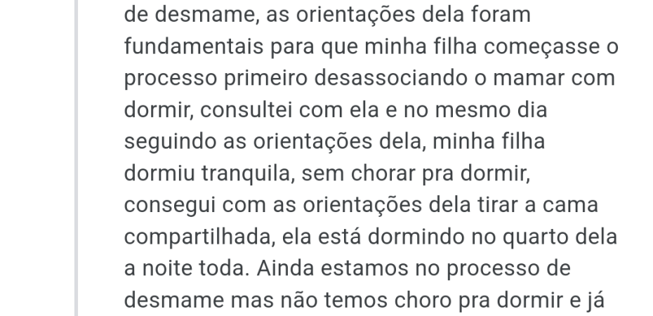 Sou imensamente grata a Zioneth pelas orientações que me deu, estamos no processo de desmame, as orientações dela foram fundamentais para que minha filha começasse o processo primeiro desassociando o mamar com dormir, consultei com ela e no mesmo dia seguindo as orientações dela, minha filha dormiu tranquila, sem chorar pra dormir, consegui com as orientações dela tirar a cama compartilhada, ela está dormindo no quarto dela a noite toda. Ainda estamos no processo de desmame mas não temos choro pra dormir e já consegui retirar uma das mamadas que acontecia durante o dia. Excelente profissional, competente, empática, disponível, acessível. O acompanhamento que ela faz traz segurança para o processo, nossa, recomendo demais o trabalho dela.