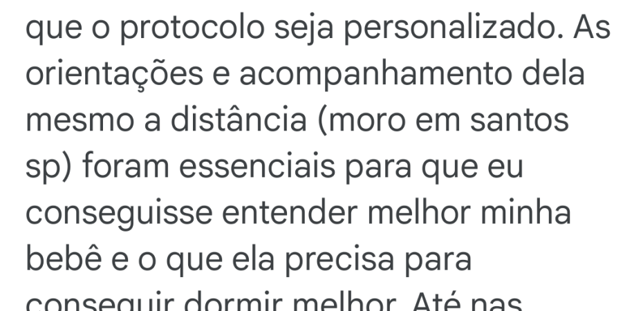 Fiz acompanhamento com a zio para que meu bebê conseguisse dormir a noite, e o resultado foi surpreendente! O atendimento dela é muito minucioso, ela da atenção a todos os detalhes pra que o protocolo seja personalizado. As orientações e acompanhamento dela mesmo a distância (moro em santos sp) foram essenciais para que eu conseguisse entender melhor minha bebê e o que ela precisa para conseguir dormir melhor. Até nas conversas pelo whatsapp ela consegue entender o que está acontecendo e me orientar. Só tenho a agradecer e recomendar a todos que precisarem, seu trabalho é baseado em evidências e muita ciência, e isso é um diferencial. Gratidão!